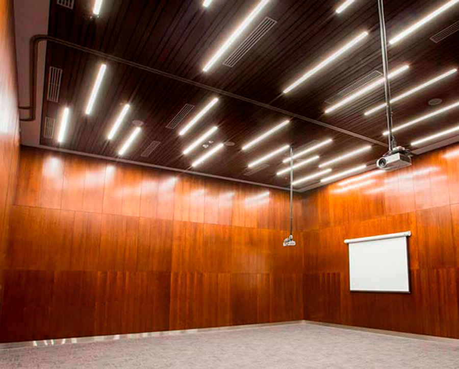 Moderno proyecto de 8 pisos, 2 mezanines y 6 sótanos, diseñado por JE Construcciones Generales. La iluminación destaca en cada área: techos con lineales LED empotrados en la recepción, colgantes decorativos en el counter, y lineales empotrados en la sala de eventos. En el exterior, rampas iluminadas con LED y una fuente con luces guía y apliques completan el diseño funcional y estético del proyecto.