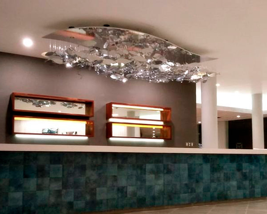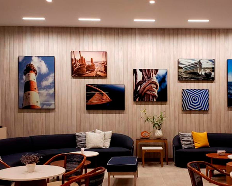 Para la iluminación, utilizamos spots empotrados LED de Lightech y Arkoslight en el comedor. En el Bar Marino, optamos por downlights LED empotrados, bañadores de pared LED y tiras flexibles LED. En la zona de vestuarios, instalamos downlights LED adosados y empotrados, luminarias herméticas LED, luces lineales LED suspendidas y tiras flexibles LED.