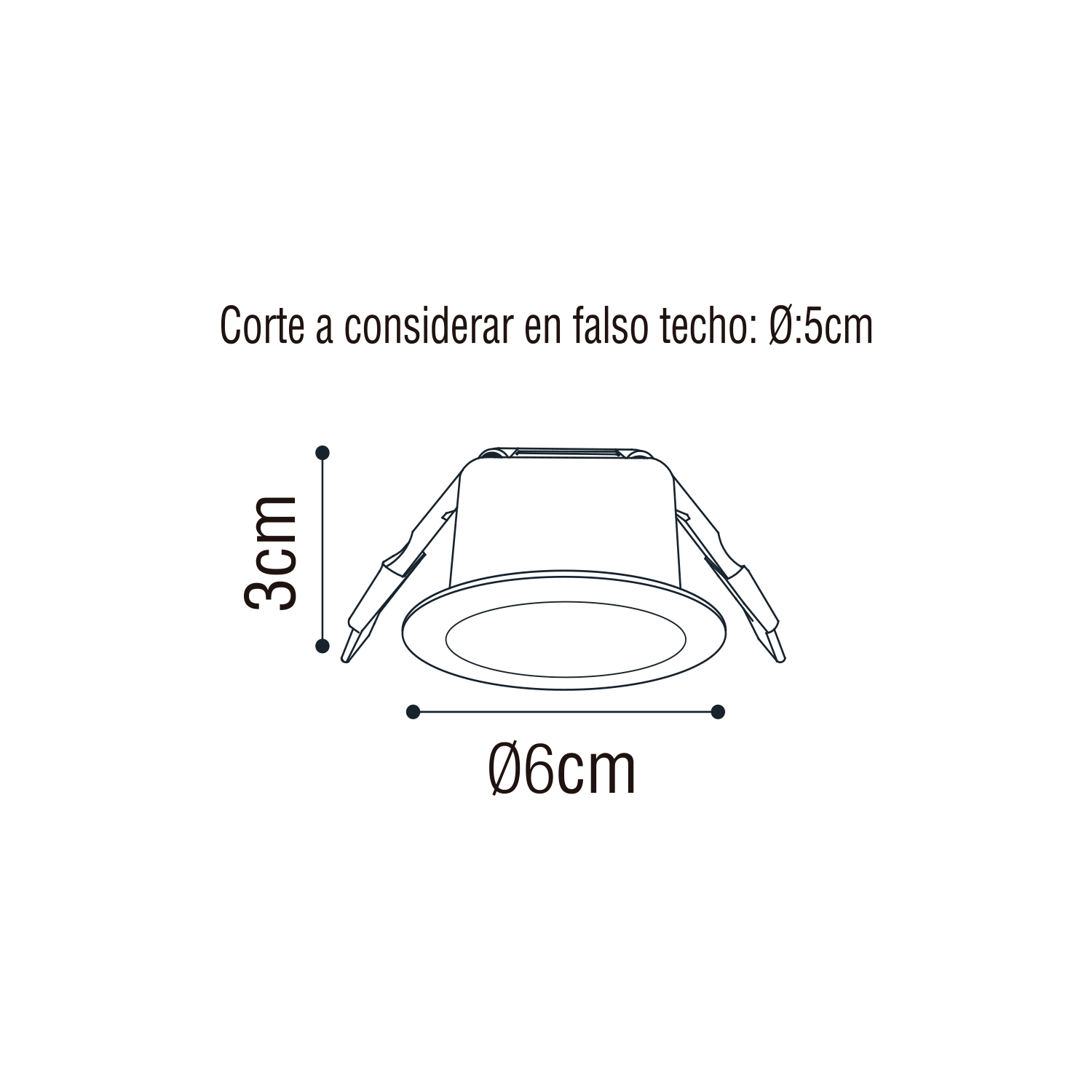 Spot LED 3W para empotrar en muebles. Uso para interiores. Características: Larga duración, alta eficiencia en iluminación, encendido instantáneo, ahorra energía, de fácil instalación.