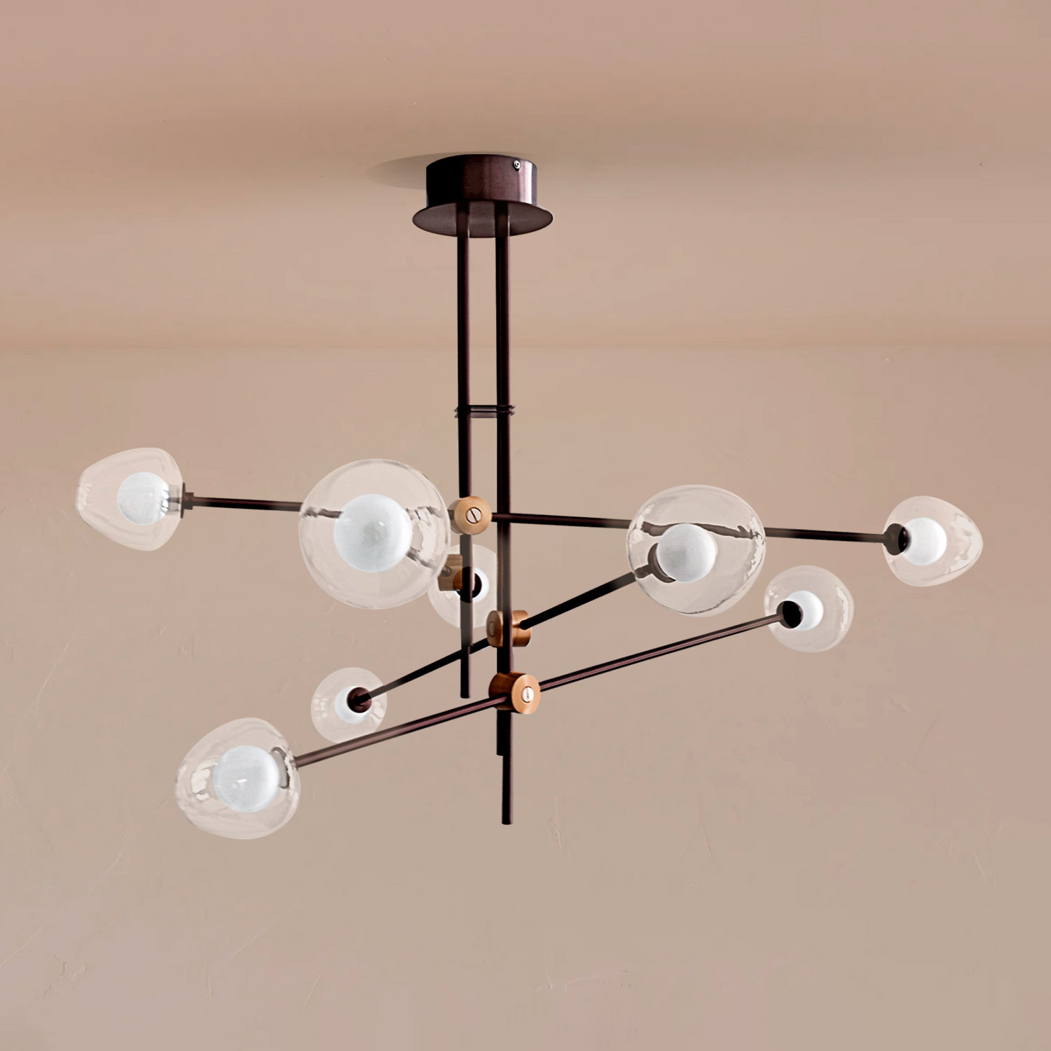Lampara colgante LED 24W NOVA luz cálida de uso interior .Canopla circular, cuerpo color marrón y detalles en dorado. Varas con bombillos en vidrio semi pavonado. Las varillas son orientables.