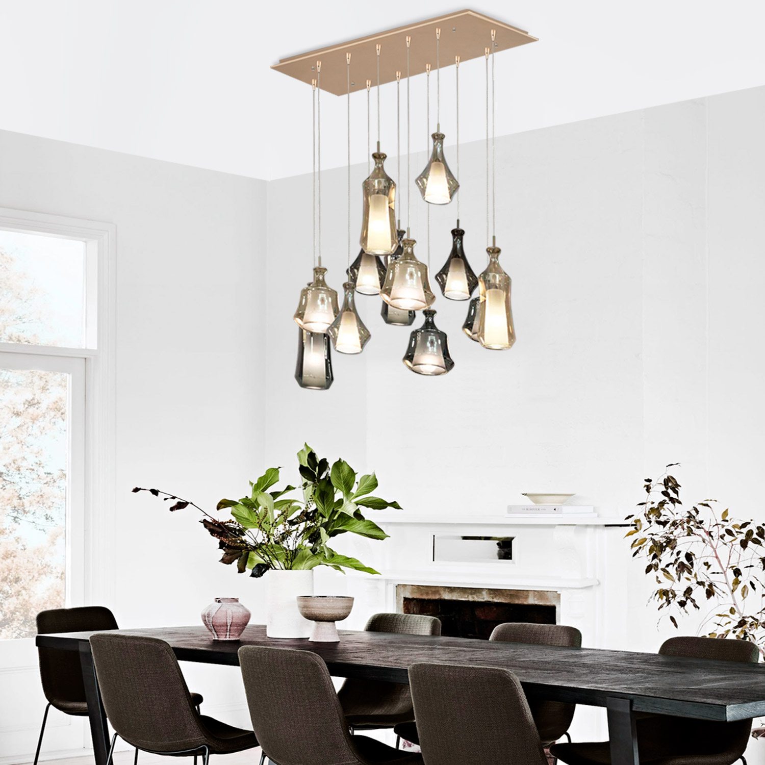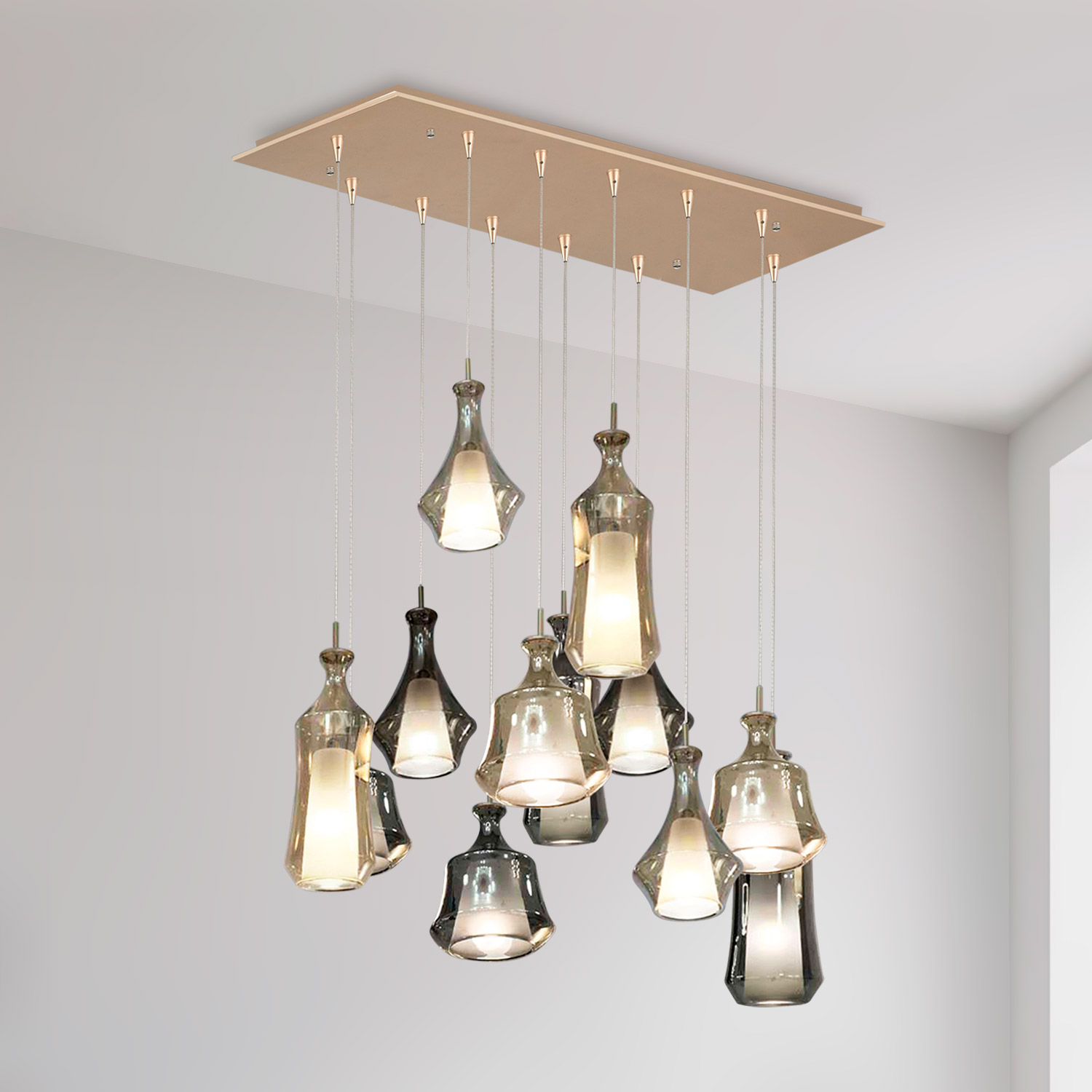 Lampara colgante BACO socket E14X12 bombillos para espacios de interior .Canopla rectangular y cuerpo color champagne con detalles en vidrio color ámbar y vidrio smoky – gris . Cada módulo se regula para crear composiciones. De diseño de tendencia en iluminación, fácil instalación y mantenimiento.