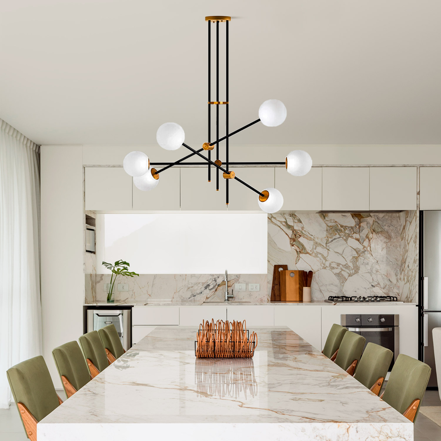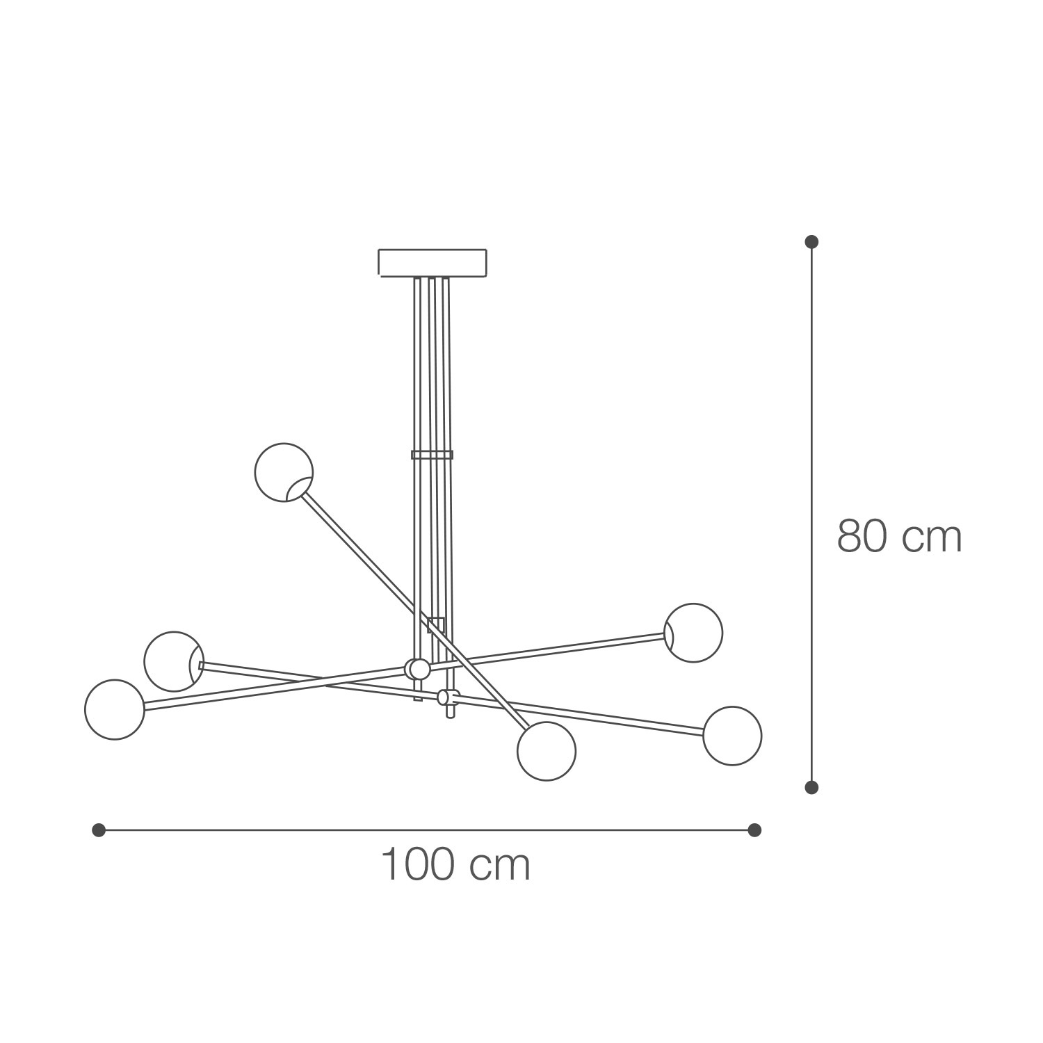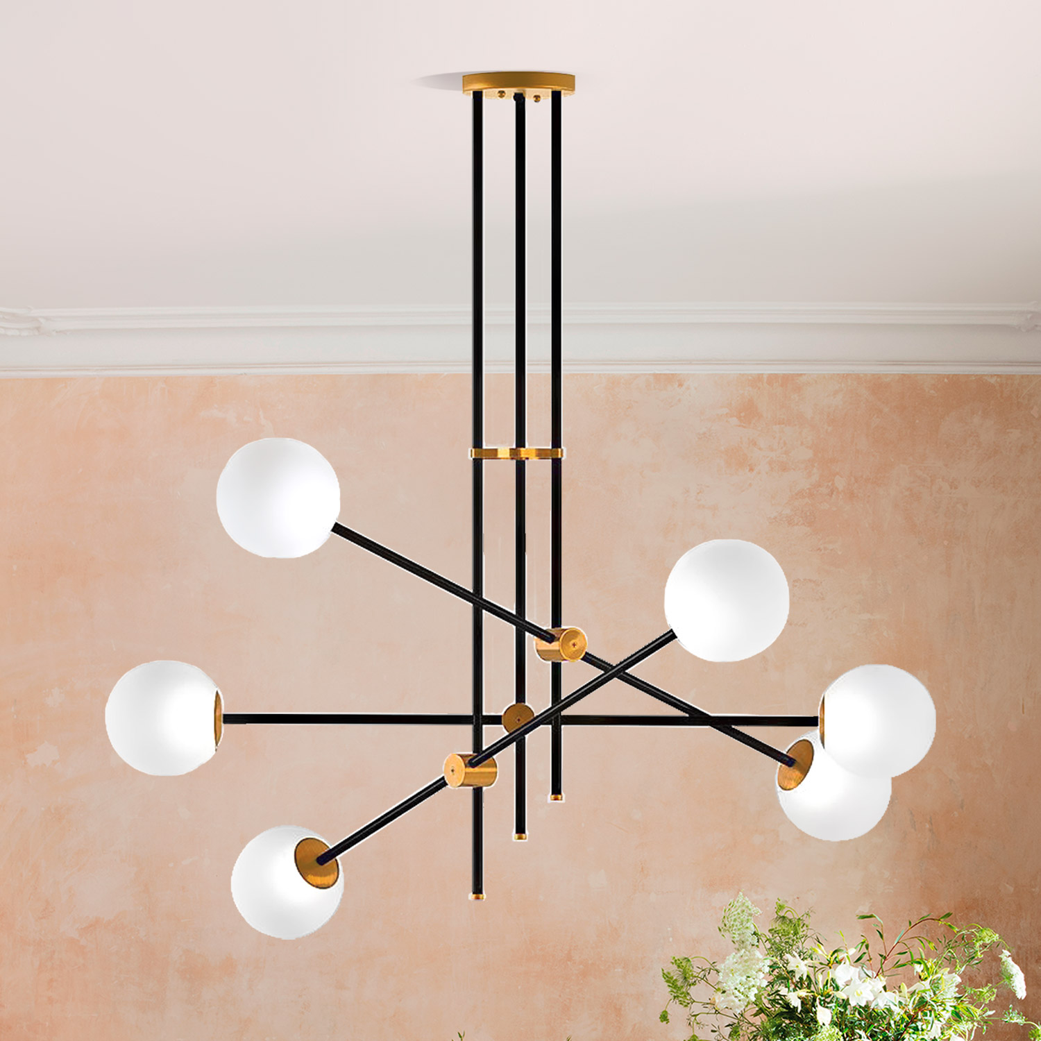 Lámpara colgante  ARGUS socket G9 X 6 focos/bombillos  Máx. 33W para suspender en espacios interiores. Cuerpo negro con detalles en dorado y esferas de vidrio.  Diseño sobrio y elegante. De fácil instalación y limpieza; no incluye focos /bombillos.