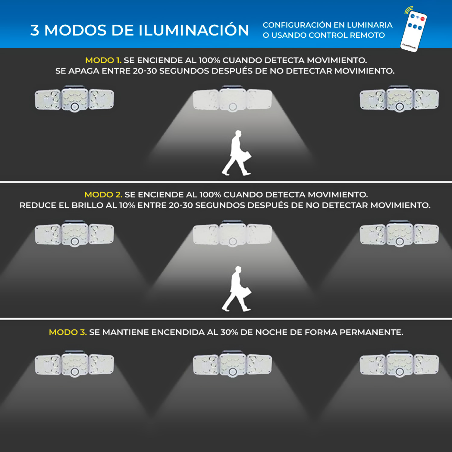 Cuenta con sensor de movimiento tipo PIR que detecta el calor en cuerpos en movimiento. Además de 2 módulos de luz dirigibles, gracias a sus brazos articulados para orientar la luz. Switch para selección de modo de funcionamiento y On/Off. Cuenta con control remoto y batería recargable de Litio . Tiempo de autonomía de 10 a 12 horas. Carga de batería completa entre 4 a 6 horas con luz solar.