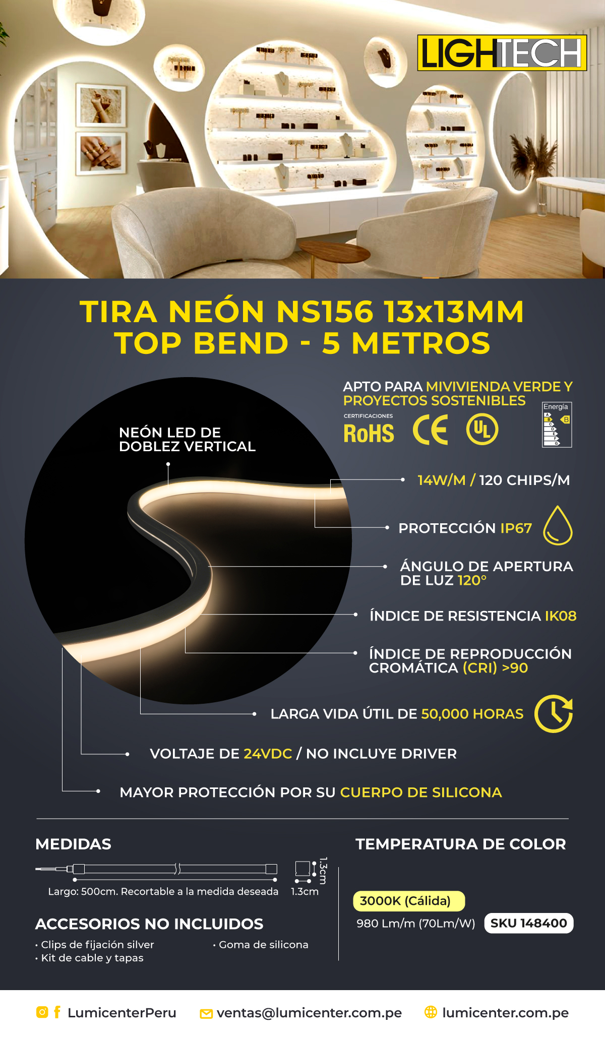 Tira Neón 13x13mm Top bend 5mts 14W/m 30K – Luz cálida 148400