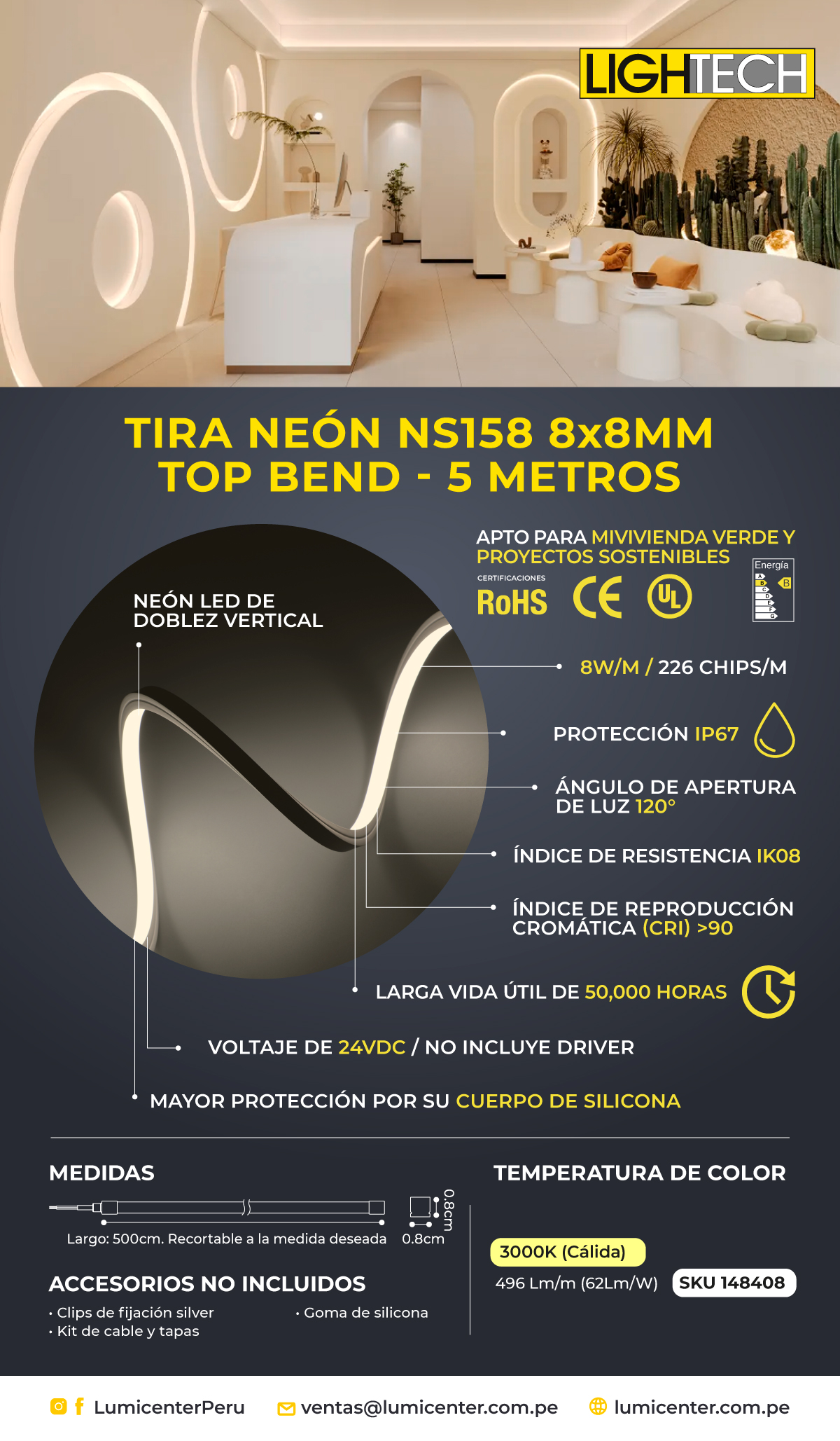 Tira Neón Top Bend de 8W/m con flexión vertical, 8 mm de superficie emisora de luz y 8 mm de altura. Perfecta para iluminar espacios de manera personalizada. Con IP67 ideal tanto para la iluminación decorativa interior como exterior. No incluye driver.