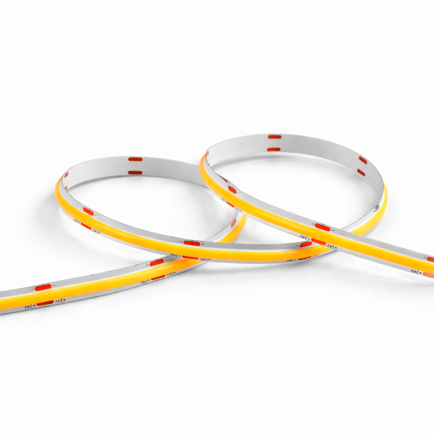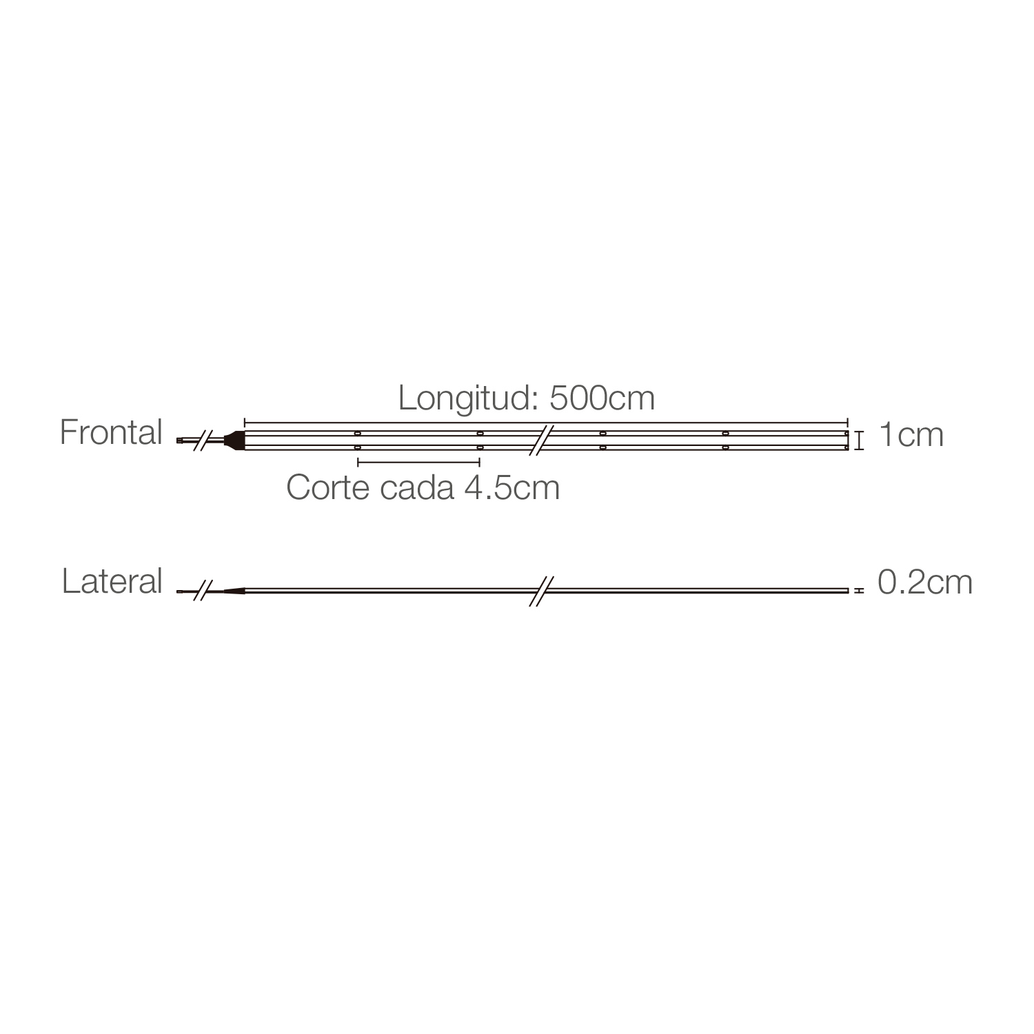 Tira LED continua COB de 5 metros perfecta para iluminar espacios de manera personalizada. Con IP20 ideal para la iluminación decorativa interior. No incluye driver. Atención: • Se debe instalar en una superficie lisa, limpia y seca. • La tira que cubre los chips LED no debe ser aplastada ni golpeada. • No incluye driver.