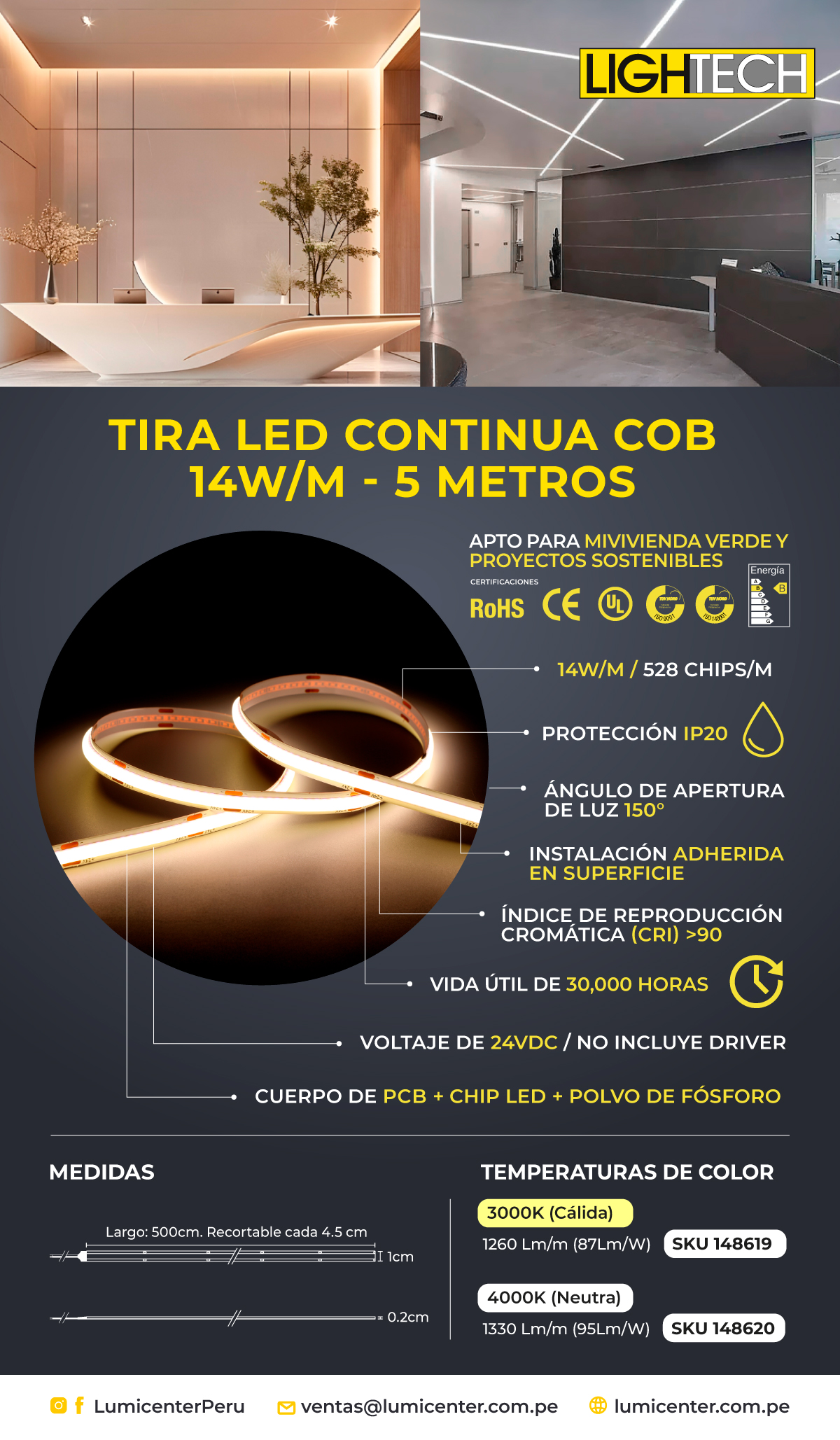 Tira Led continua cob 5mts 14W/m 1260Lm IP20 – Luz cálida 148619